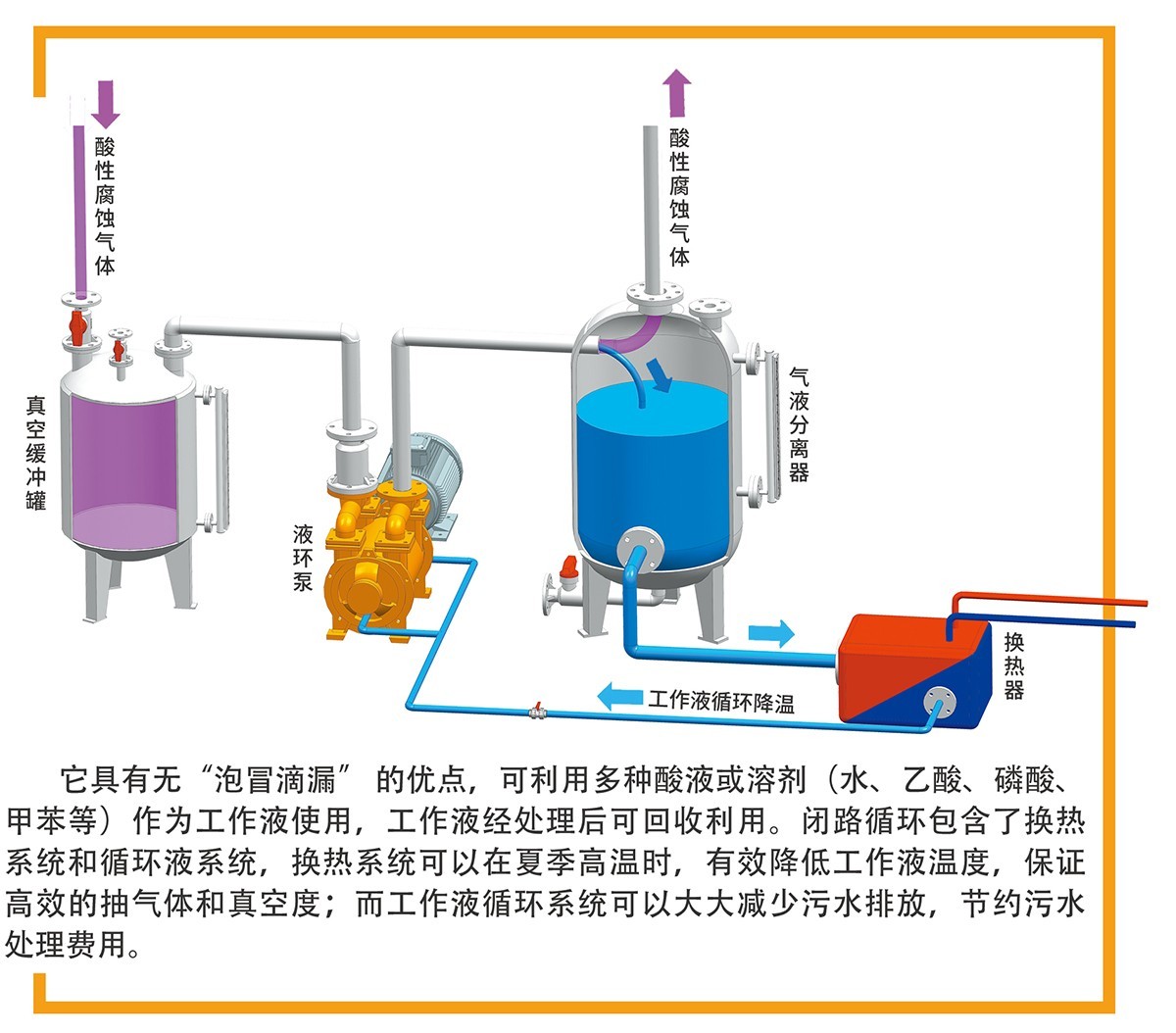 耐腐蝕液環(huán)泵可以升級(jí)為閉路循環(huán)系統(tǒng),它由FSK系列、F2SK系列、F2BV系列、F2BE系列和JZJFS羅茨泵系列,與真空換緩沖罐、汽液分離器、換熱器、連接管路等串聯(lián)組成。閉路循環(huán)與用戶DCS連接可實(shí)現(xiàn)自動(dòng)控制。